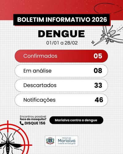 A Secretaria Municipal de Saúde de Marialva atualizou, nesta quarta-feira (4), o panorama epidemiológico da cidade referente ao primeiro bimestre do ano. O boletim, que compreende as oito primeiras semanas de 2026 (01 de janeiro a 28 de fevereiro), revela um cenário de alerta, embora controlado: foram confirmados 5 casos positivos da doença no período.